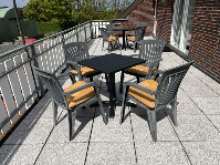 Eine 41 m² große Dachterrasse mit Tischen und Stühlen steht zur gemeinsamen Nutzung zu Verfügung.